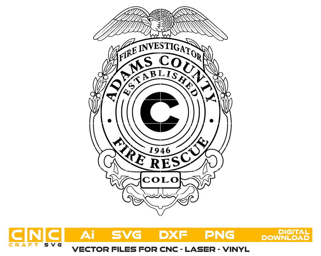 Ideal for engravers, designers, and firefighters, this Adams County Fire Investigator Badge vector ensures clean edges, sharp details, and perfect scaling for both print and digital use.