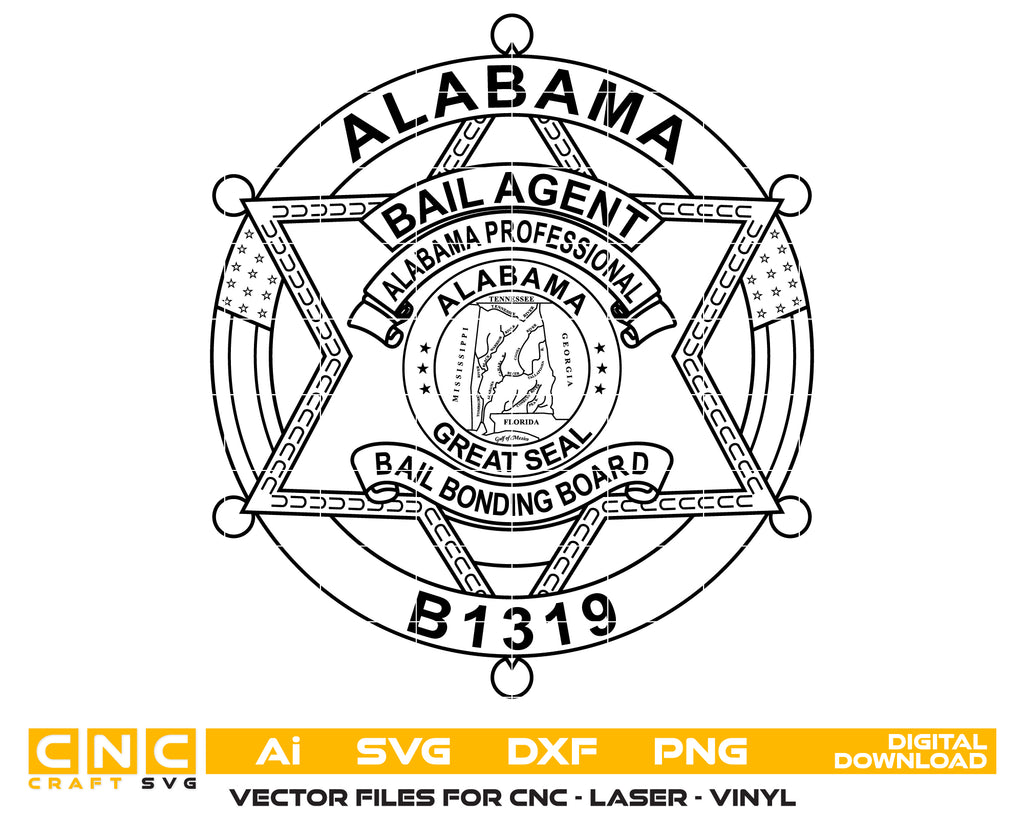 Create professional, law enforcement-style designs with this Alabama Bail Bonding Board Bail Agent Badge SVG — a detailed and scalable vector digital design crafted for crafters, designers, and collectors.