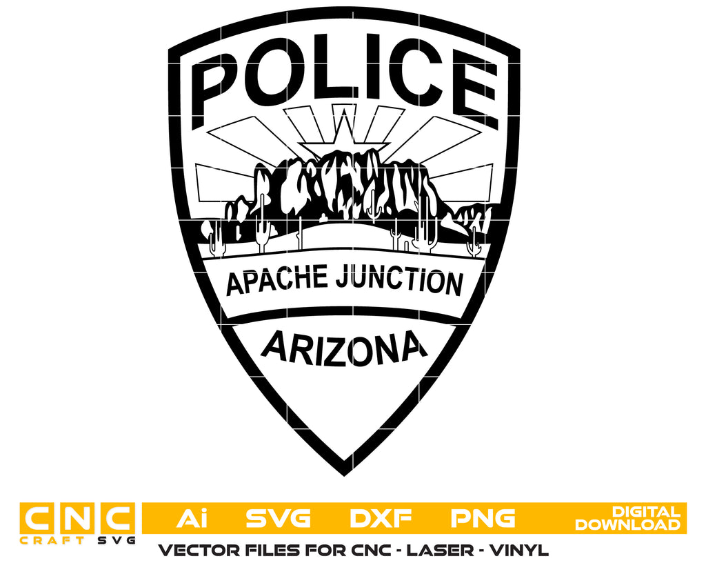 The Apache Junction Police Logo SVG represents the proud identity of Arizona law enforcement. This vector emblem is ideal for engraving, vinyl decals, uniform embroidery, CNC cutting, and official display projects. Designed with precise vector detailing, this SVG police logo ensures professional-grade results across digital and physical formats. Perfect for department signage, collectible memorabilia, or training materials, this design reflects the honor and dedication of the Apache Junction Police Department.