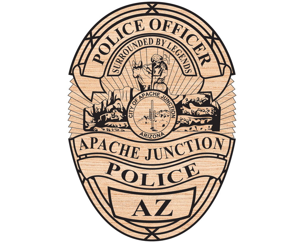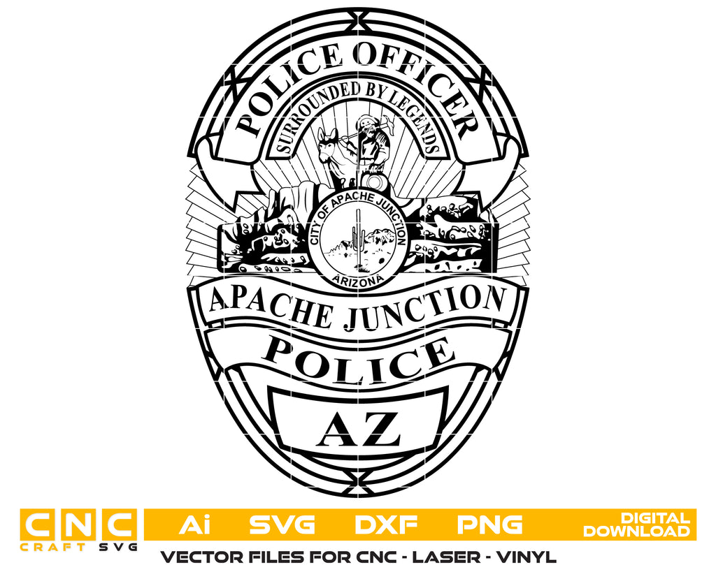 The Apache Junction Police Officer Badge SVG is a professional Arizona law enforcement emblem designed in scalable vector format. Perfect for CNC cutting, laser engraving, vinyl decals, uniform patches, commemorative plaques, and department branding, this police badge vector delivers sharp, precise details. Ideal for police memorabilia, training materials, and custom engraving, this design ensures authenticity and clarity on metal, wood, acrylic, and fabric surfaces. Represent the pride and professionalism of the Apache Junction Police Department with this high-quality SVG.