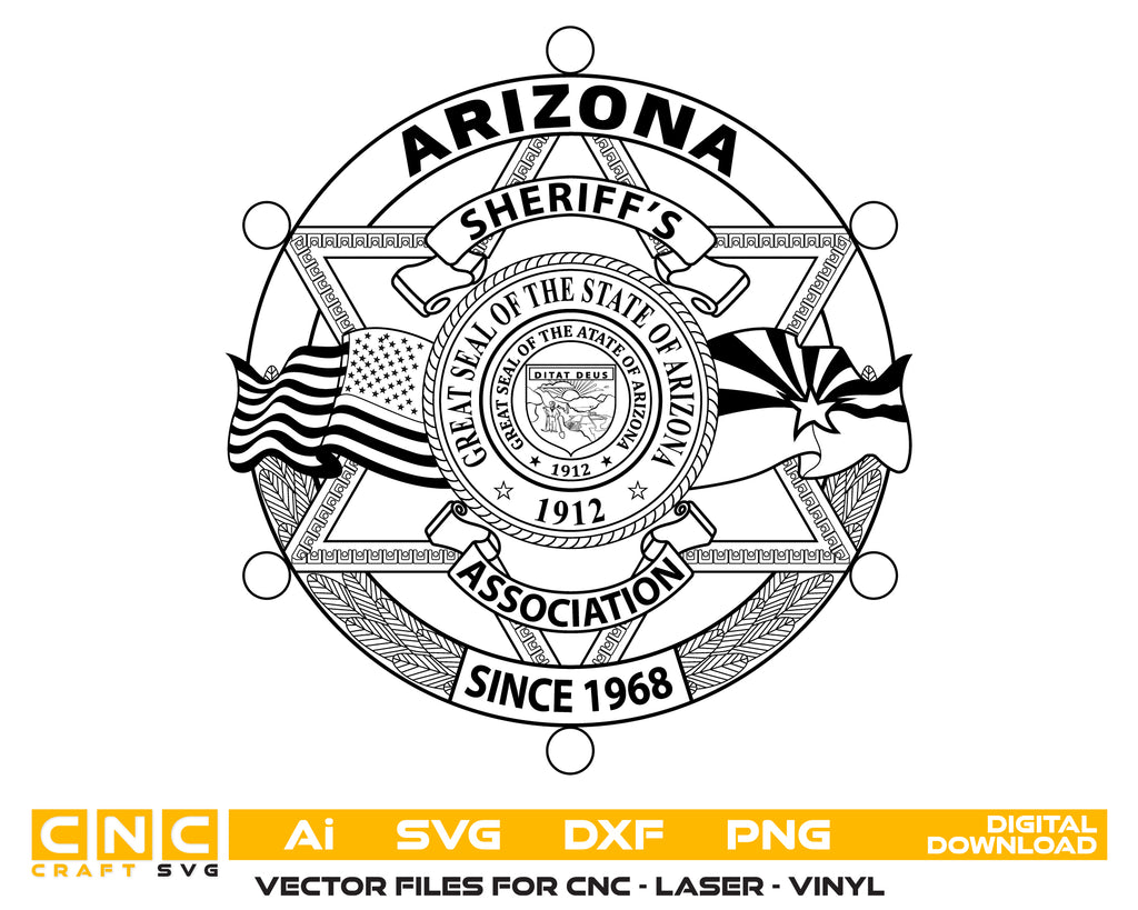 Download a high-quality Arizona Sheriff Association Badge SVG, expertly crafted in precise vector format — ideal for Cricut, Silhouette, CNC, Glowforge, engraving, decals, apparel printing, and official-style artwork. This detailed badge design maintains authentic elements and sharp vector lines for professional results.