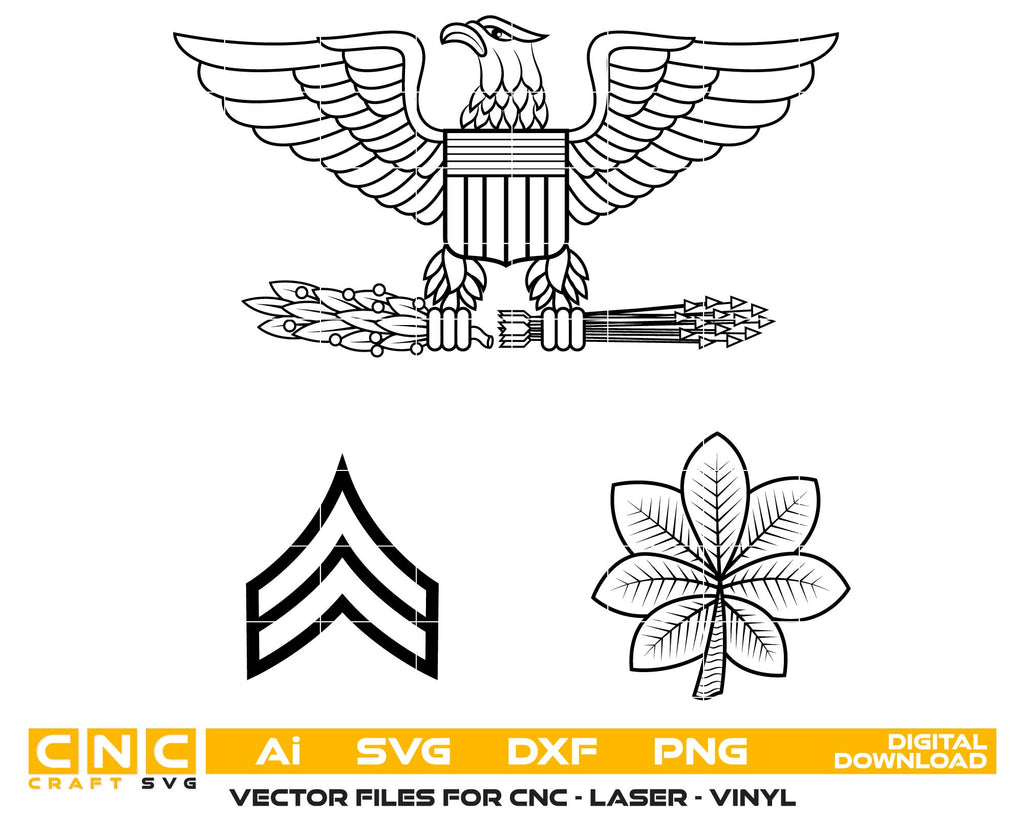 Download a professionally crafted U.S. Army Colonel Rank Insignia SVG featuring crisp detailing, clean vector lines, and perfect scalability. This premium eagle insignia design is ideal for Cricut, Silhouette, CNC machines, laser engraving, embroidery, decals, apparel printing, challenge coins, plaques, and military-themed projects.