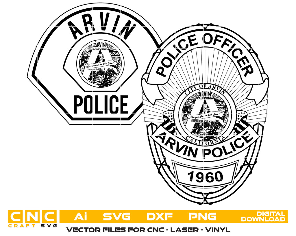 The Arvin Police Department Badge SVG is a detailed California law enforcement emblem designed in scalable vector format. Ideal for CNC cutting, laser engraving, vinyl decals, uniform patches, commemorative plaques, and department signage, this badge ensures crisp, professional results. Perfect for police memorabilia, department recognition, and custom engraving projects, this SVG delivers authentic law enforcement imagery for metal, wood, fabric, and acrylic surfaces. Represent the pride and dedication of the Arvin Police Department with this high-quality design.