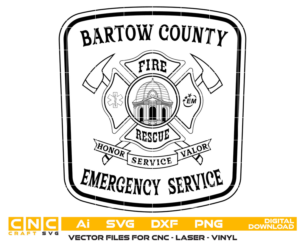 The Bartow County Emergency Service Patch SVG is a detailed Georgia public safety emblem recreated in high-quality vector format. Ideal for CNC cutting, laser engraving, vinyl decals, uniform patches, commemorative plaques, and emergency service signage, this design ensures crisp, scalable results. With precise vector lines, it works seamlessly on wood, metal, fabric, and acrylic. A perfect choice for emergency service memorabilia, public safety recognition, and custom woodworking projects, this file provides both authenticity and professional quality.