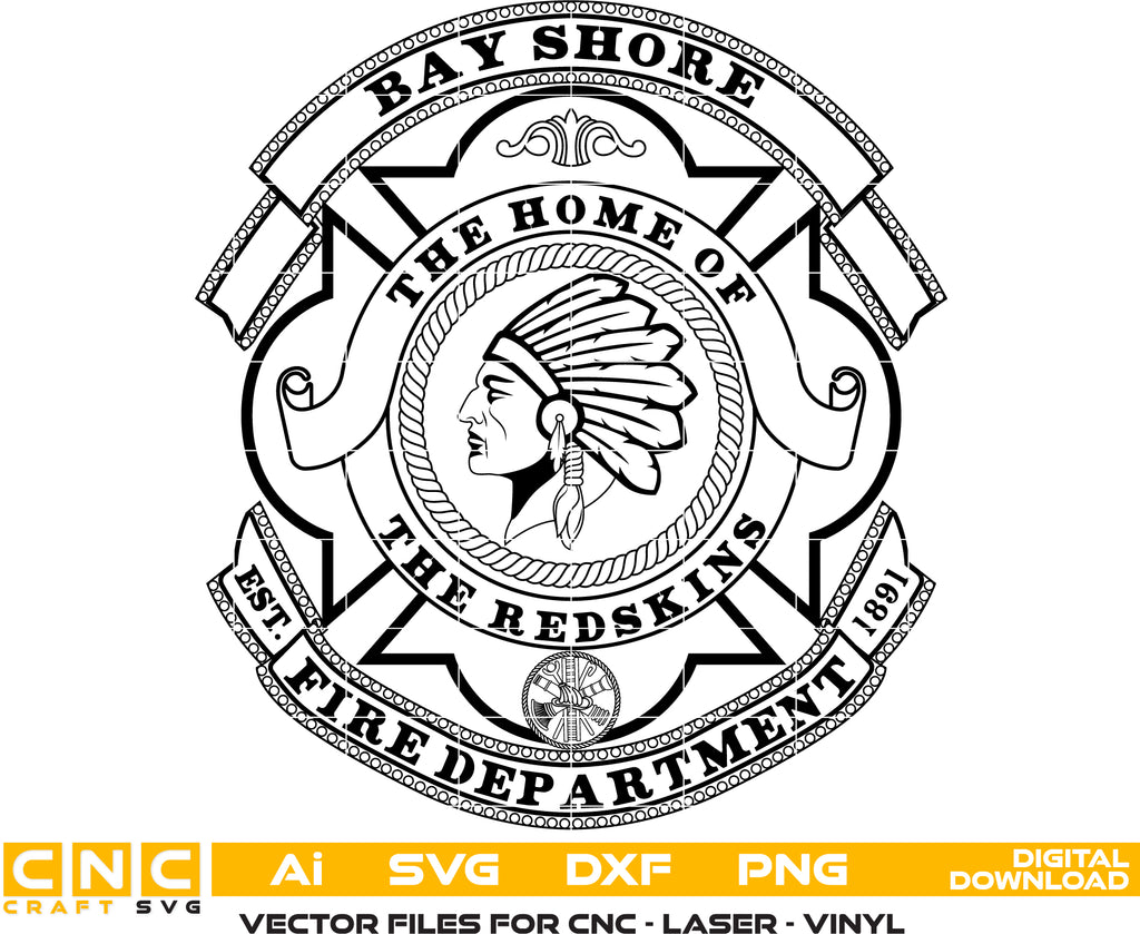 Perfect for firefighter collectibles, department memorabilia, or Bay Shore–themed crafts, this fire department badge vector ensures crisp edges, smooth lines, and precise accuracy at any size.