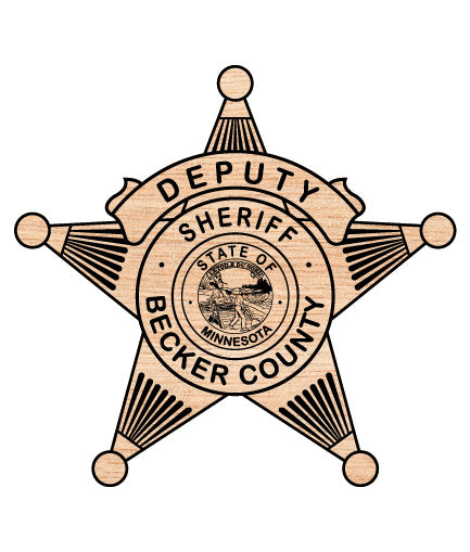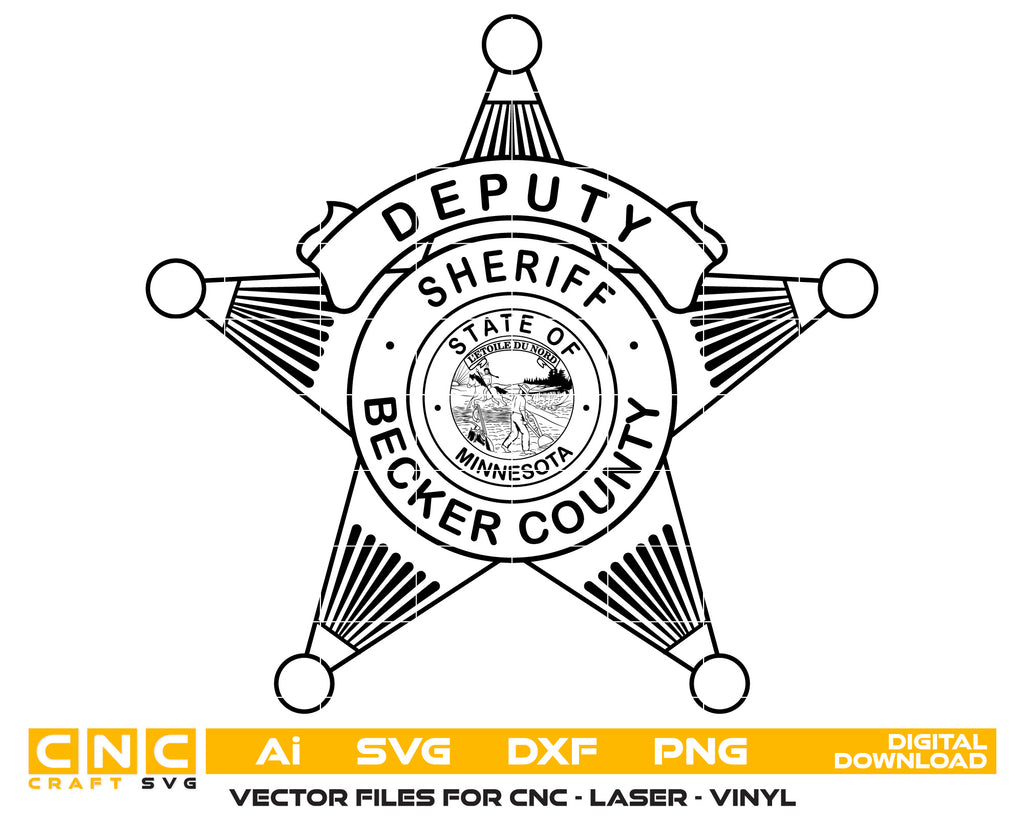 Represent the Land of 10,000 Lakes with this Becker County Deputy Sheriff Badge SVG. This classic five-point star design features the "Deputy Sheriff" rank banner and the detailed Great Seal of the State of Minnesota (L'Étoile du Nord) at its center. Meticulously traced for precision, this file is optimized for CNC routing, laser engraving, and vinyl cutting. It is the perfect choice for creating retirement plaques, shadow boxes, and custom department tributes.