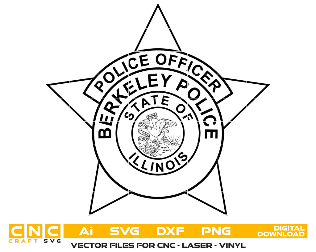 Detailed and scalable Berkeley Police Officer Badge SVG, ideal for official-style displays, memorabilia, signage, engraving, decals, apparel, embroidery, and both digital and print projects. Professionally crafted vector ensures crisp lines, sharp details, and accuracy at any size.
