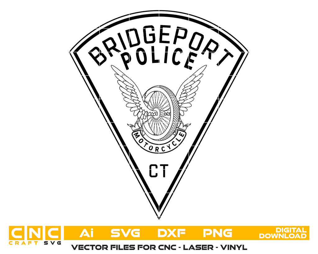 The Bridgeport Police Department Motorcycle Unit Patch SVG is a specialized Connecticut law enforcement emblem designed in precise vector format. Perfect for CNC cutting, laser engraving, vinyl decals, uniform patches, and department plaques, this file delivers clean results on wood, metal, acrylic, and fabric. With sharp vector lines, it’s ideal for motorcycle unit collectibles, official signage, memorabilia, and custom décor, making it a versatile choice for crafters and collectors alike.
