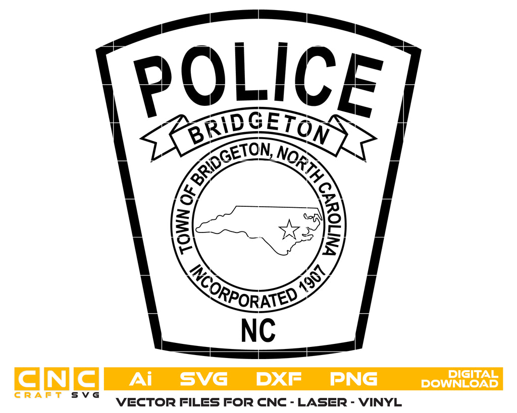 Celebrate the heritage of Bridgeton, North Carolina with this Bridgeton Police Department Patch SVG. This detailed vector design features the town's official seal, including the North Carolina state outline and the "Incorporated 1907" founding date. Precision-traced for clean cutting and engraving, this file is perfect for creating commemorative plaques, wooden flags, and custom vinyl decals. Whether for a retirement gift or a department tribute, this artwork ensures professional, high-quality results.