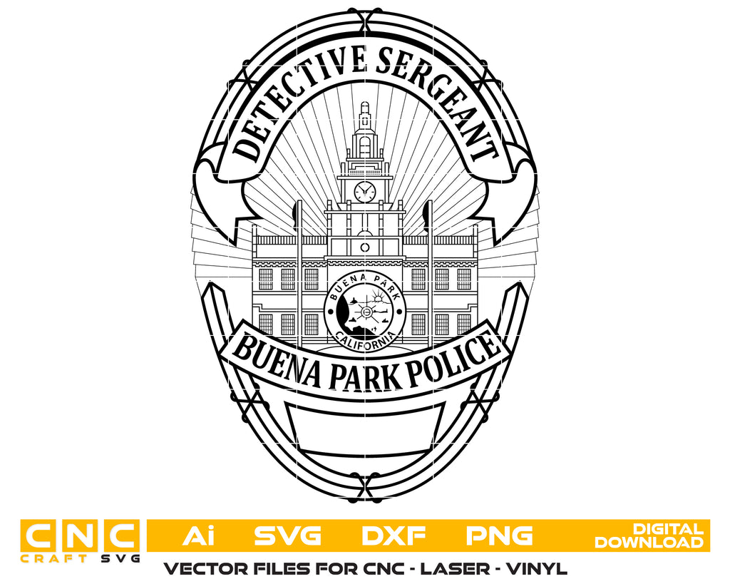 The Buena Park Police Detective Sergeant Officer Badge SVG is a detailed California law enforcement emblem designed in scalable vector format. Perfect for CNC cutting, laser engraving, vinyl decals, uniform patches, commemorative plaques, and department signage, this badge ensures crisp, professional results. Ideal for police memorabilia, department recognition, and custom engraving projects, it reflects the dedication and authority of the Buena Park Police Department. Compatible with metal, wood, fabric, and acrylic surfaces for versatile application.