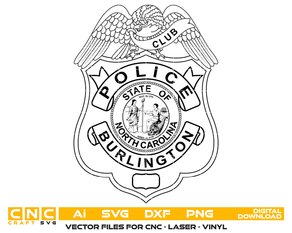 Honor the dedication, professionalism, and service of North Carolina law enforcement with this Burlington Club Police Badge SVG — a crisp, high-quality vector design perfect for crafting, printing, engraving, and commemorative projects.
