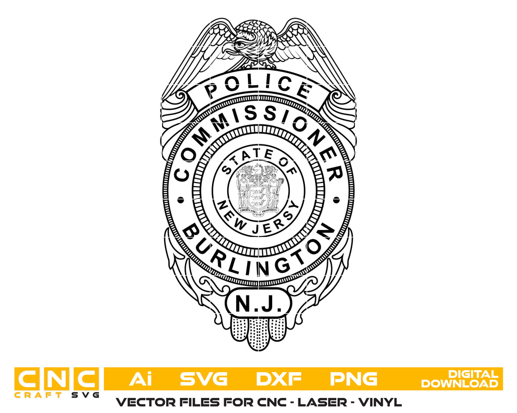 The Burlington Police Commissioners Badge SVG is a professional New Jersey law enforcement emblem recreated in precise vector format. This badge design is perfect for CNC cutting, laser engraving, vinyl decals, plaque engraving, uniform decoration, and signage. With sharp vector lines, it produces clean, scalable results on wood, acrylic, metal, or fabric. Ideal for commissioner plaques, department signage, collectible memorabilia, and custom woodworking projects, it offers both accuracy and authenticity for makers and collectors.