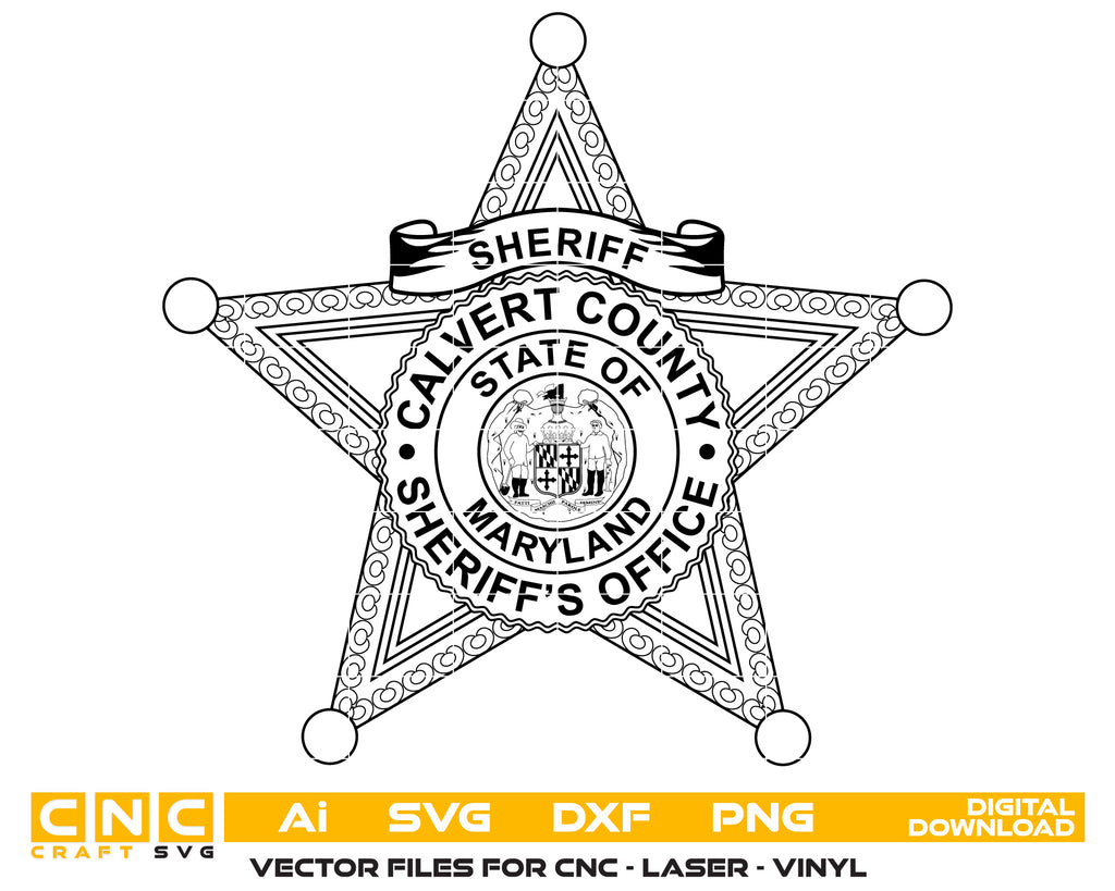 The Calvert County Sheriff’s Badge SVG is a finely detailed Maryland law enforcement seal that represents integrity, duty, and honor. Expertly crafted in scalable vector format, it’s ideal for CNC cutting, laser engraving, vinyl decals, uniform badges, signage, and commemorative plaques. Designed for professional precision, this badge is perfect for collectors, engravers, and department recognition projects. It delivers sharp vector accuracy across metal, wood, fabric, or acrylic surfaces.
