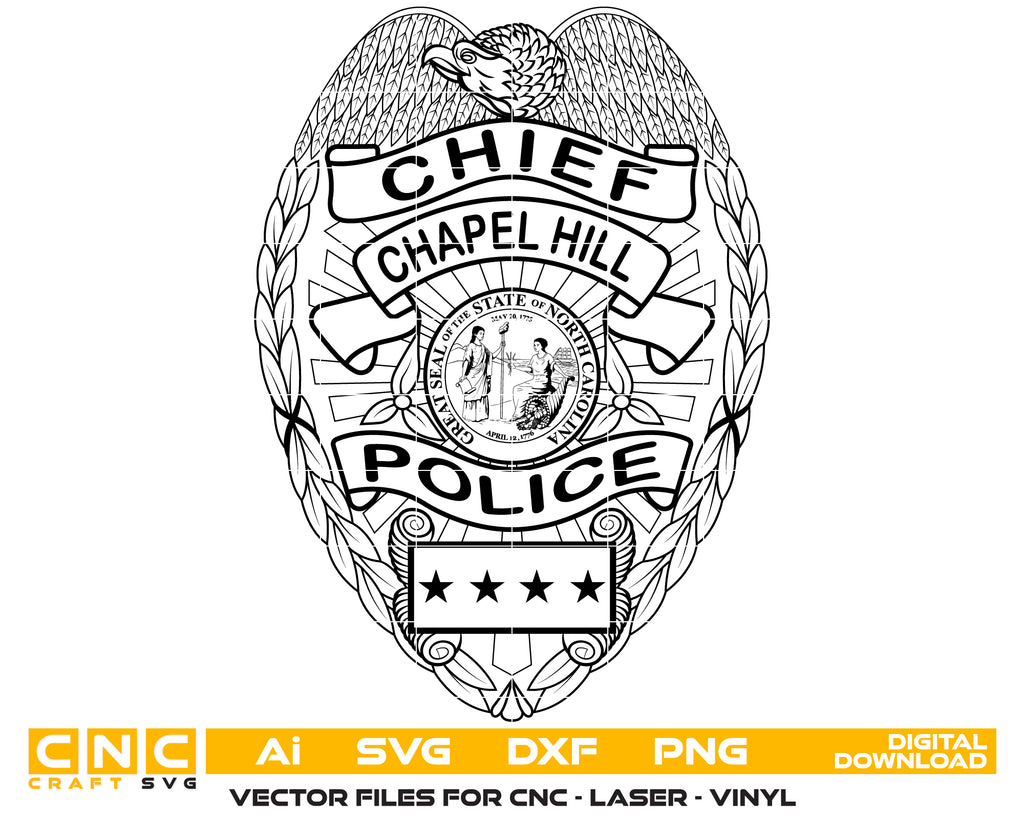 Download a professionally crafted Chapel Hill Police Department Chief Badge SVG, designed with sharp vector details and smooth lines for perfect scalability. Ideal for Cricut, Silhouette, CNC cutting, laser engraving, decals, signage, apparel printing, and police memorabilia projects.