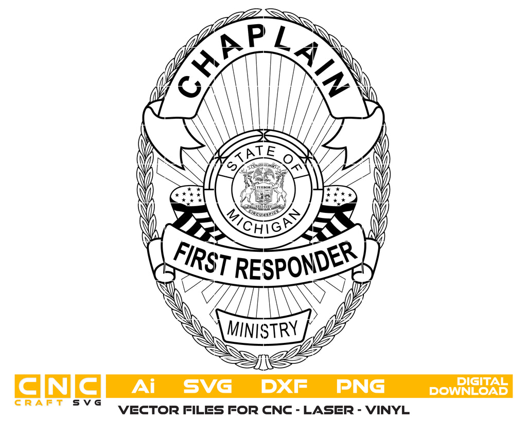 The Chaplain First Responder Badge SVG is a meaningful Michigan law enforcement emblem carefully crafted in professional vector format. Designed for precision, it’s perfect for CNC cutting, laser engraving, vinyl decals, uniform decoration, commemorative plaques, and department signage. Its sharp vector lines ensure clean, scalable results on wood, metal, fabric, and acrylic. Ideal for chaplain memorabilia, first responder tributes, and custom woodworking projects, this badge design provides both authenticity and professional detail.