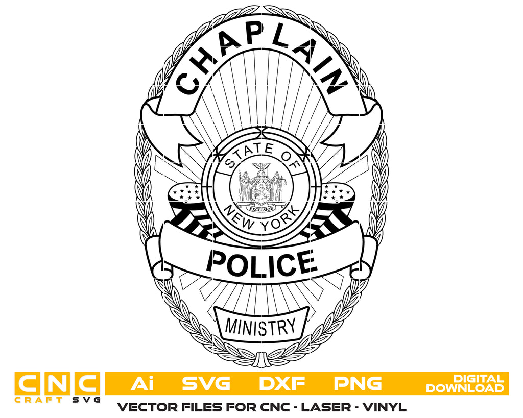 The Chaplain Police Department Badge SVG is a distinguished New York law enforcement emblem designed in precise vector format. Perfect for CNC cutting, laser engraving, vinyl decals, uniform decoration, department plaques, and official signage, this badge ensures clean, scalable results on wood, metal, fabric, and acrylic. Ideal for chaplain recognition, police memorabilia, and custom woodworking projects, it delivers authenticity and professional quality for engravers, crafters, and collectors.