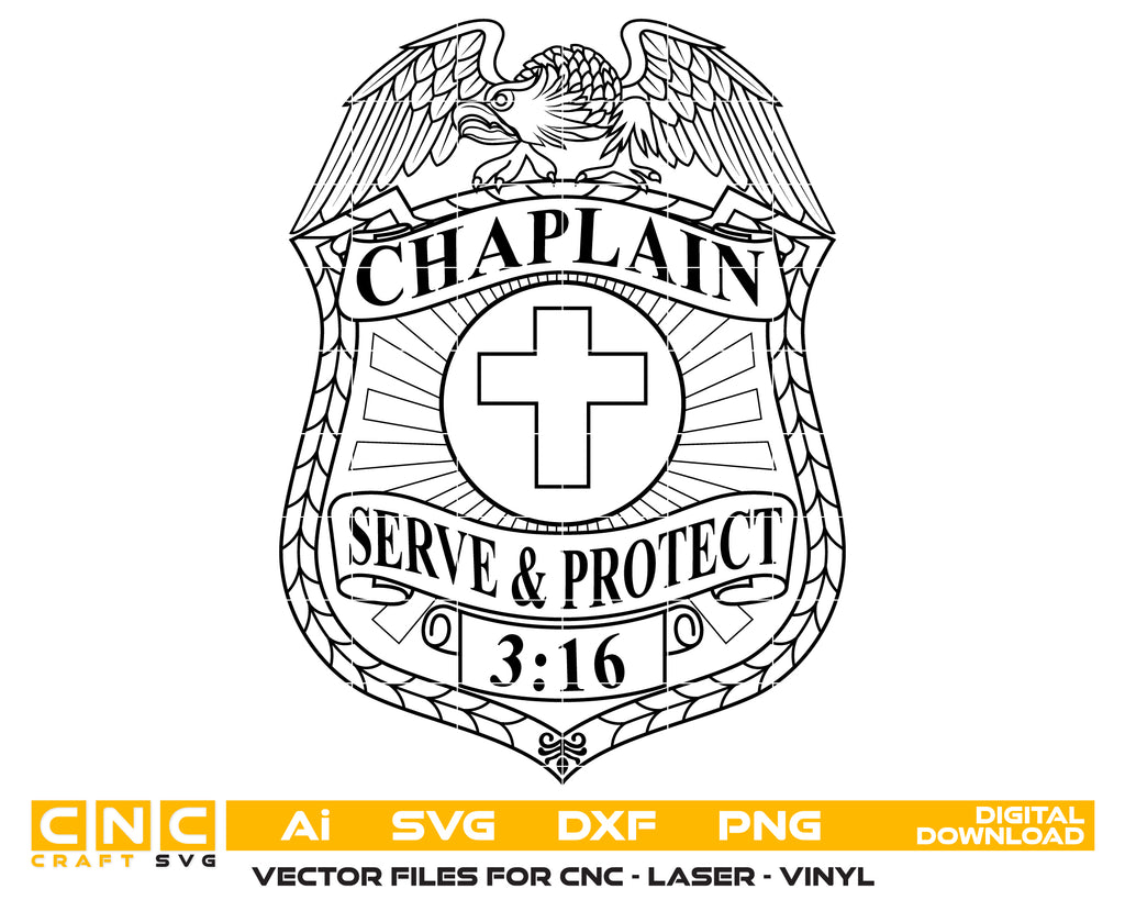 Honor the dedication, service, and spiritual support of law enforcement chaplains with this Chaplain Serve and Protect Police Badge SVG — a crisp, high-quality vector design perfect for crafting, printing, engraving, and commemorative projects.