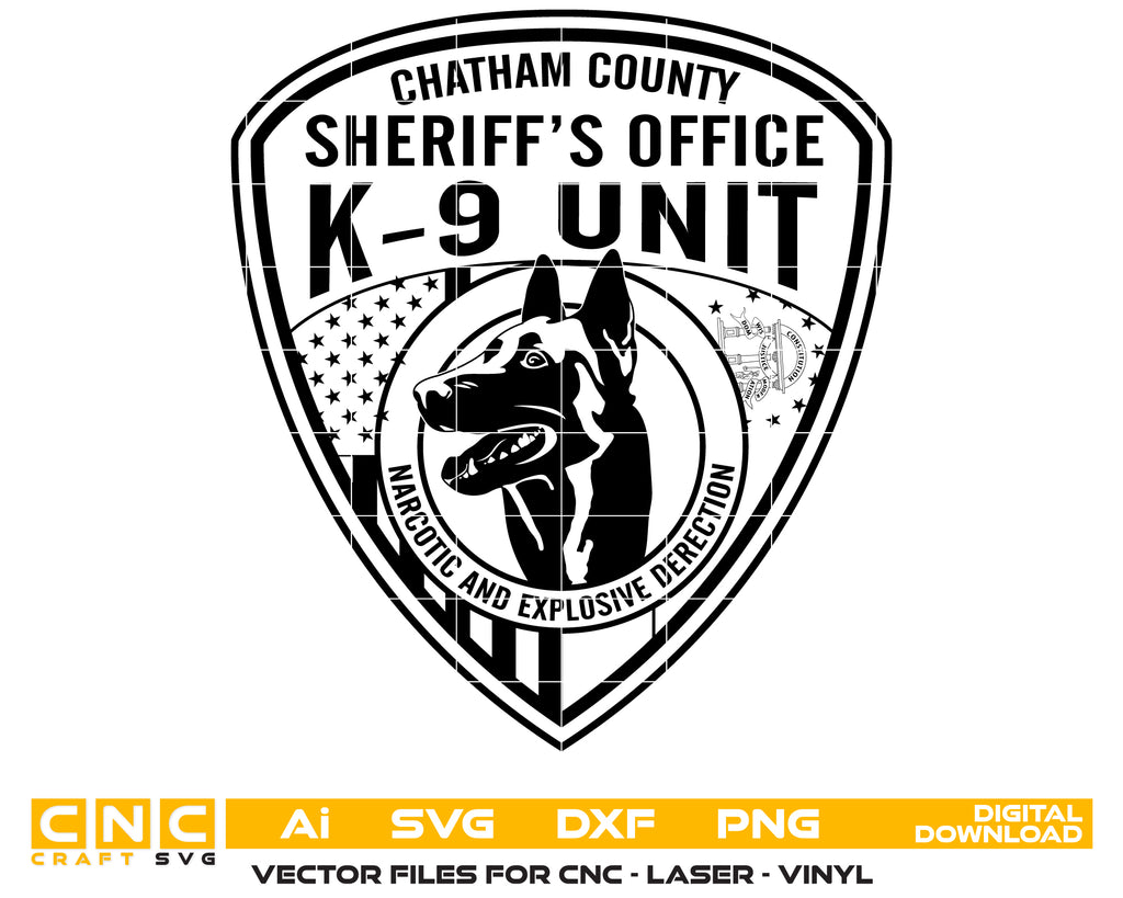 The Chatham County Sheriff’s K-9 Unit Logo SVG is a detailed Georgia law enforcement design that honors the loyalty and courage of police service dogs. Created in scalable vector format, it’s ideal for CNC cutting, laser engraving, vinyl decals, uniform patches, department signage, and commemorative plaques. With sharp detailing and professional accuracy, this logo is perfect for K-9 handlers, collectors, and engraving projects across metal, wood, and fabric materials.