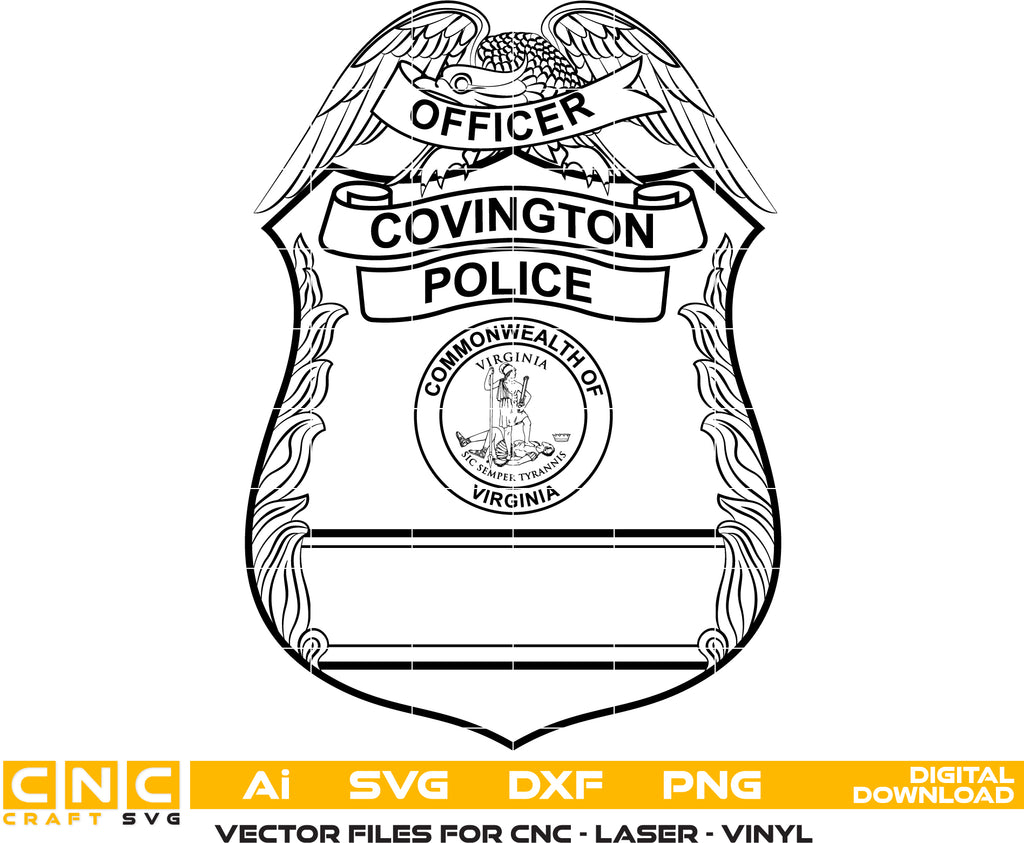 This City of Covington Virginia Police Badge SVG is a high-precision vector design, perfect for professional fabrication. Featuring the spread-wing eagle topper, the official Seal of the Commonwealth of Virginia with the "Sic Semper Tyrannis" motto, and the "Officer" rank banner, this file is fully optimized with clean, closed paths to ensure flawless results on CNC routers, fiber lasers, and CO2 laser machines without any pixelation.