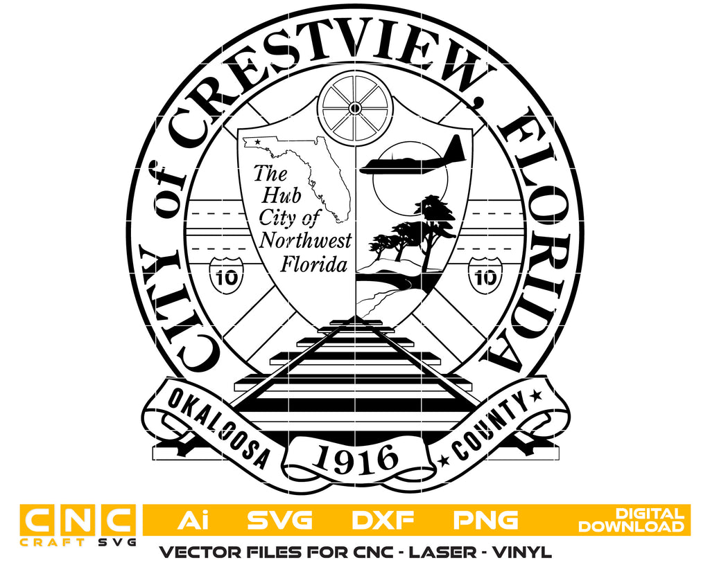 Get the official City of Crestview, Florida Logo in a clean, high-quality vector format—perfect for digital and handmade projects. Ideal for Cricut, Silhouette, Glowforge, and laser or vinyl cutting machines, this design works great for civic signage, custom apparel, decals, and memorabilia.