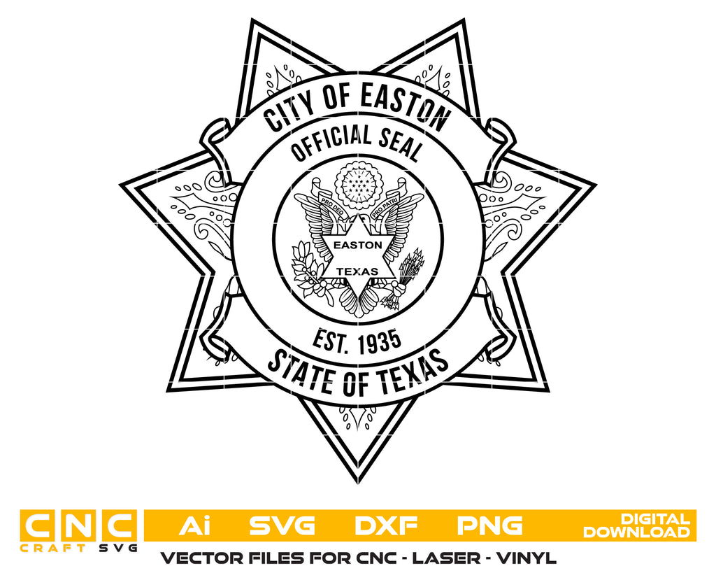 The City of Easton Sheriff Badge SVG is a finely detailed Texas law enforcement emblem provided in professional vector format. Suitable for CNC cutting, laser engraving, vinyl decals, uniform decoration, commemorative plaques, and municipal signage, this design ensures sharp, scalable results on wood, metal, fabric, and acrylic. Ideal for sheriff memorabilia, county recognition, and custom woodworking projects, this badge offers authenticity and precision for collectors, engravers, and crafters.