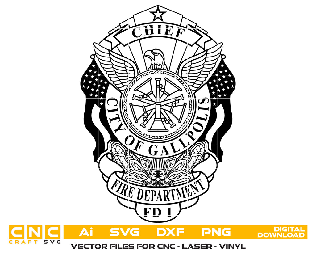 Honor the leadership, bravery, and dedication of Ohio firefighters with this City of Gallipolis Fire Department Chief Badge SVG — a crisp, high-quality vector design perfect for crafting, printing, engraving, and commemorative projects.
