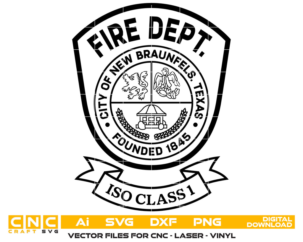 Download the City of New Braunfels Fire Department Badge in a high-quality, scalable vector format. Perfect for laser engraving, Cricut, Silhouette, Glowforge, and CNC machines. This detailed design is ideal for creating firefighter tribute signs, decals, apparel, mugs, wall art, and personalized gifts honoring first responders.