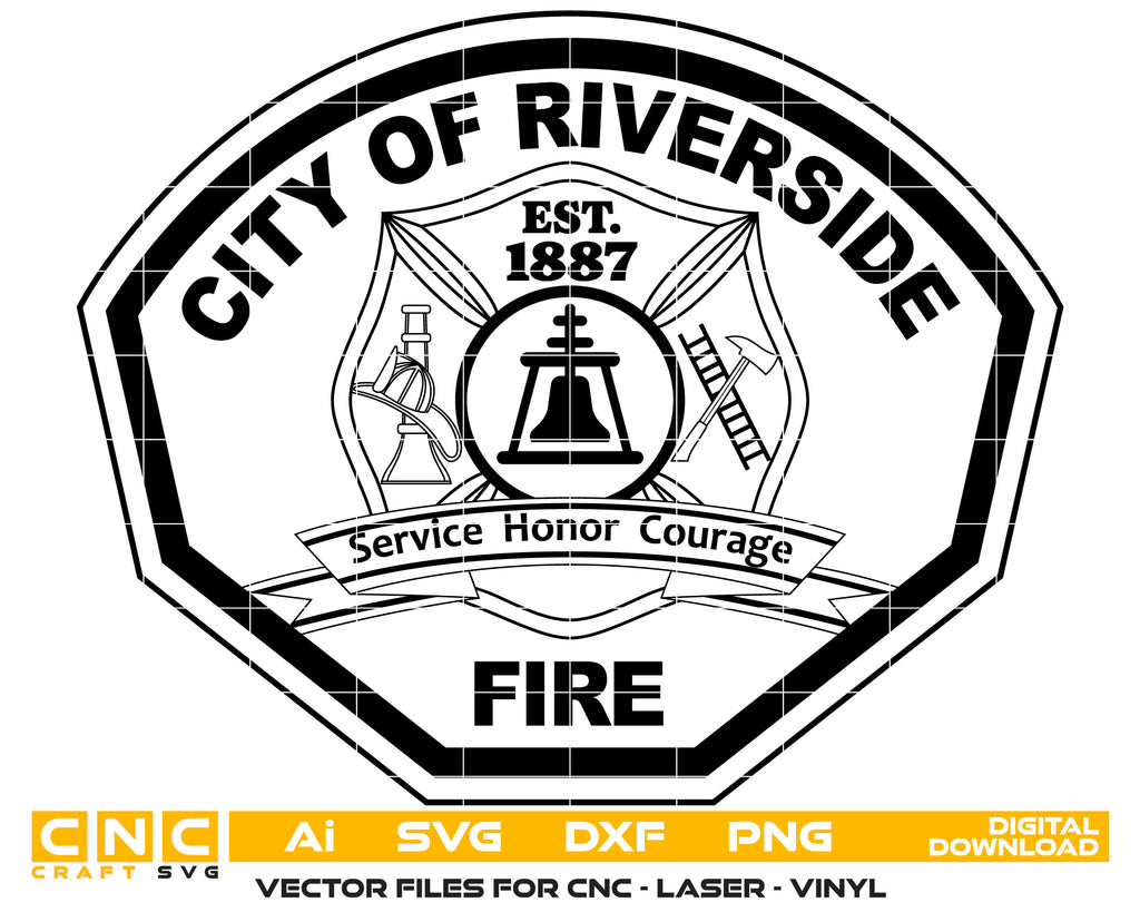 Celebrate the dedication of local heroes with this City of Riverside Fire Department Badge vector design. Perfect for laser engraving, Cricut, Silhouette, Glowforge, and more, this high-resolution file is ideal for crafting firefighter gifts, personalized items, decals, and wall art.