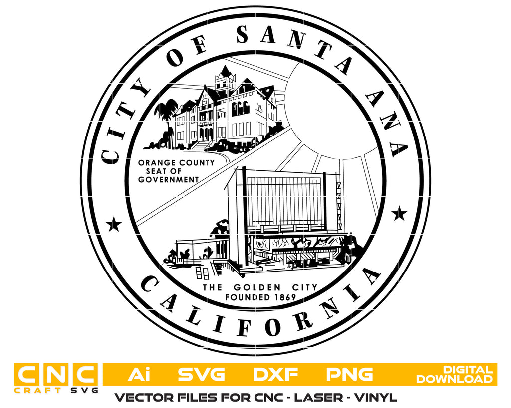Showcase the official seal of Santa Ana, California in your custom creations with this high-quality digital vector file. Ideal for laser engraving, Cricut projects, Silhouette cutting, printing, and more. Use it for city-themed crafts, signs, shirts, decals, and decor.