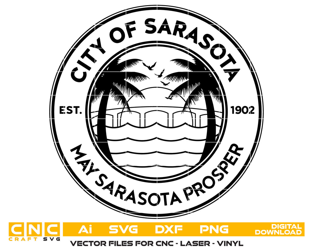 Showcase the charm and history of Sarasota with this official City Seal SVG. Ideal for use in civic, educational, or community-related projects. The design comes in SVG, PNG, DXF, and AI formats for versatile use.