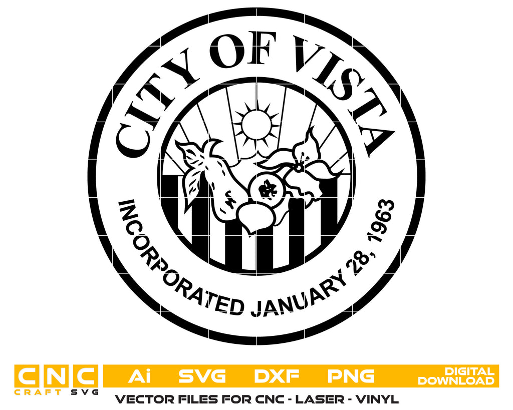 Create professional-quality designs with this City of Vista Seal SVG, a clean and detailed vector illustration inspired by the official city seal of Vista, California. Designed for accuracy and clarity, this seal artwork is ideal for high-quality cutting, engraving, and printing applications.