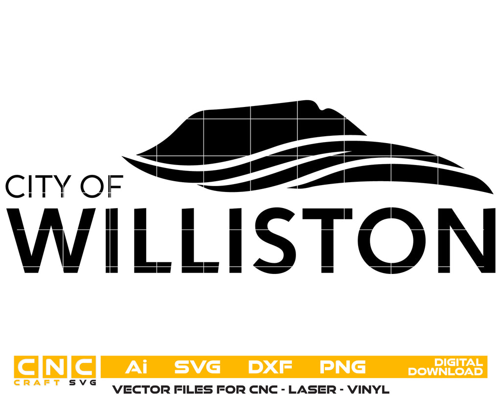 Download the City of Williston Logo in a clean, scalable vector format. Perfect for use with Cricut, Silhouette, Glowforge, laser engravers, and CNC machines. This official-style logo is great for city-themed signage, decals, mugs, apparel, awards, and custom gifts that celebrate Williston’s civic identity.