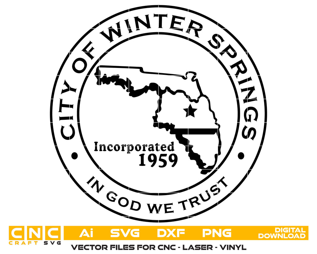 Download the City of Winter Springs, Florida Seal in a clean, high-resolution vector format. Perfect for laser engraving, Cricut, Silhouette, Glowforge, and CNC machines. This official-style seal is ideal for creating civic signs, custom plaques, decals, apparel, mugs, and personalized gifts that reflect Winter Springs’ identity and pride.