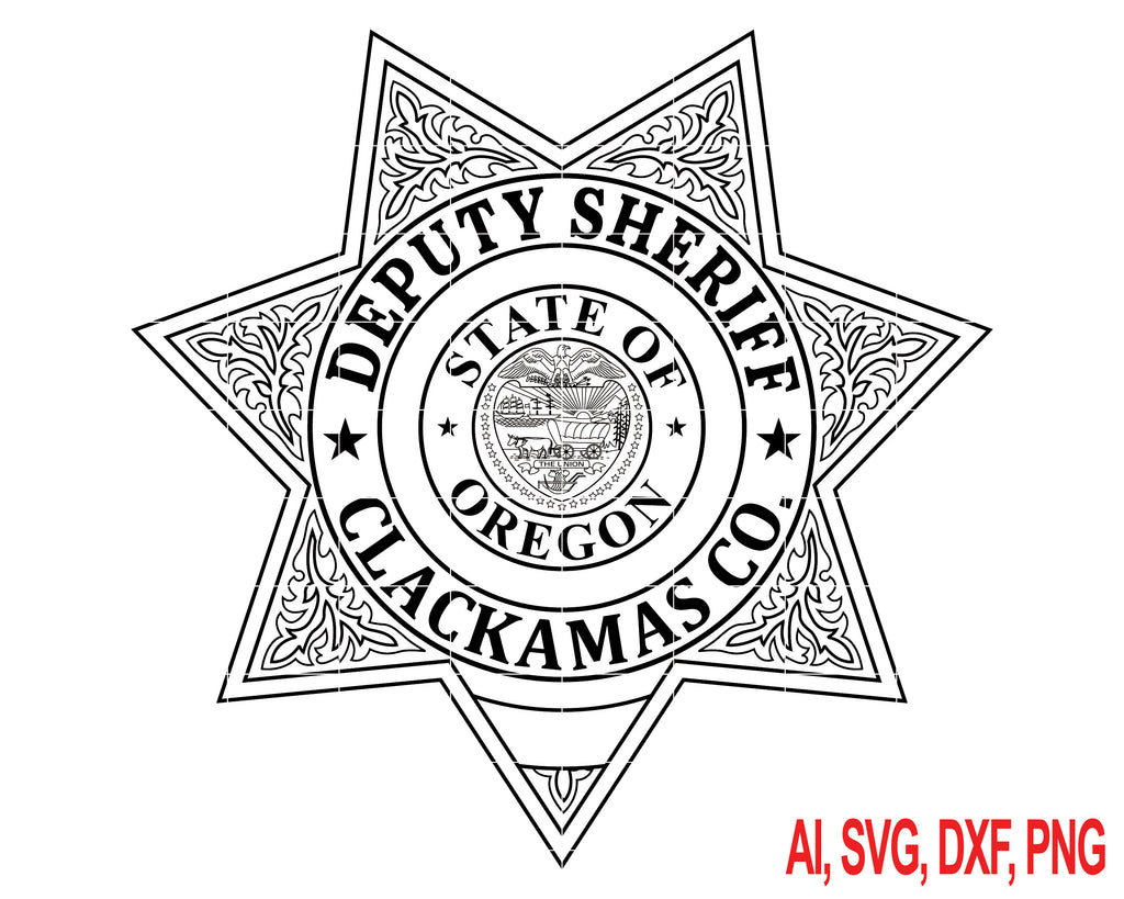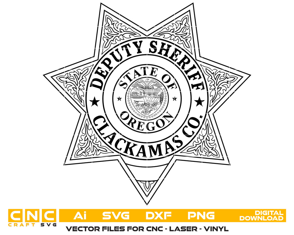 Represent the Pacific Northwest with this Clackamas County Deputy Sheriff Badge SVG. This intricate seven-point star design features the detailed State of Oregon seal at its center, surrounded by classic scrollwork on the badge points. Expertly traced for precision, this file is optimized for CNC routing, laser engraving, and vinyl cutting. Whether you are crafting a retirement plaque, a wooden flag tribute, or custom department gear, this vector ensures a sharp, professional finish.