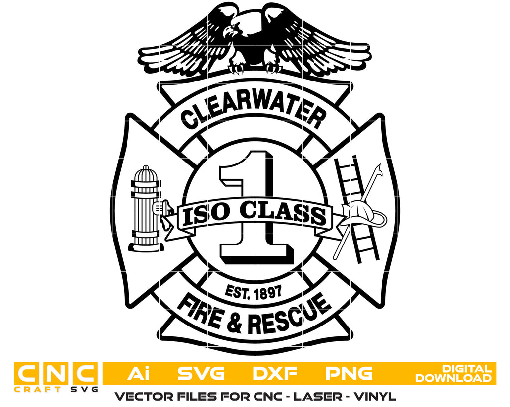 Celebrate the bravery of first responders with the official Clearwater Fire & Rescue Department Badge vector design. Perfect for custom crafts, apparel, signage, and commemorative items, this high-quality digital file works seamlessly with Cricut, Silhouette, Glowforge, laser cutters, and vinyl machines.