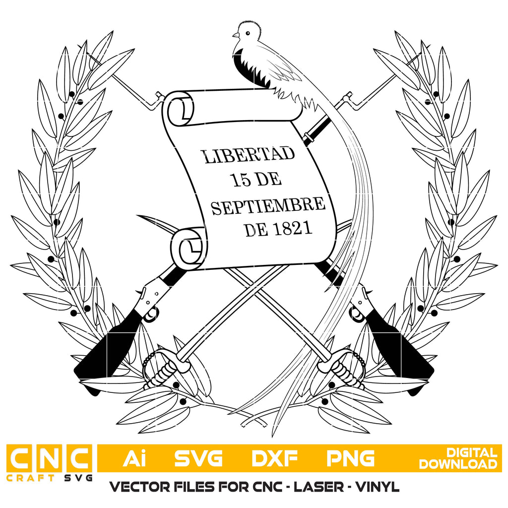 This Coat of Arms of Guatemala SVG is a high-precision vector design, perfect for professional fabrication. Featuring the resplendent Quetzal bird, crossed rifles, and swords behind a central scroll with the independence date, this file is fully optimized with clean, closed paths to ensure flawless results on CNC routers, fiber lasers, and CO2 laser machines without any pixelation.