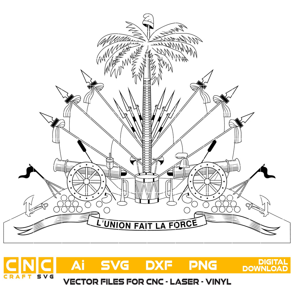 This Coat of Arms of Haiti SVG is a high-precision vector design, perfect for professional fabrication. Featuring the iconic palmiste (royal palm) topped with the Phrygian cap, surrounded by cannons, flags, and the national motto "L'Union Fait La Force," this file is fully optimized with clean, closed paths to ensure flawless results on CNC routers, fiber lasers, and CO2 laser machines.