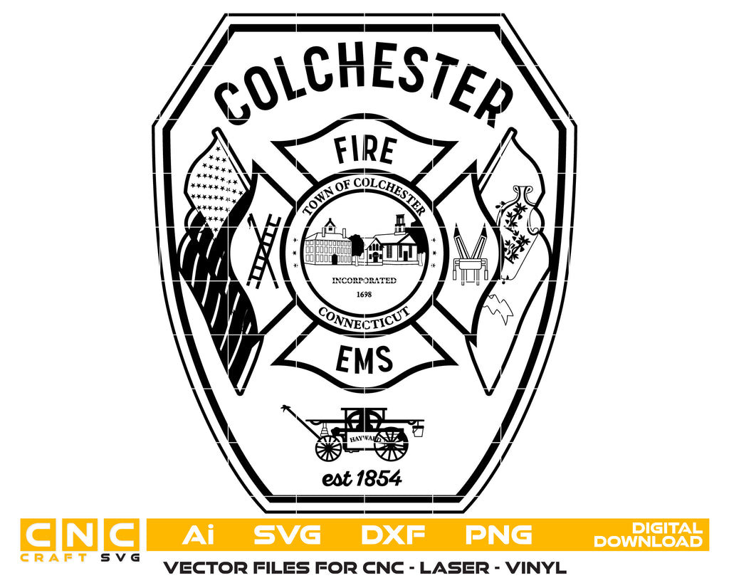 The Colchester Fire Department Badge SVG is a detailed firefighter emblem designed in professional vector format. This versatile design is perfect for CNC cutting, laser engraving, vinyl decals, uniform decoration, commemorative plaques, and department signage. Its crisp vector lines ensure sharp, scalable results on wood, metal, fabric, and acrylic. A great choice for firefighter recognition, department memorabilia, and custom woodworking projects, this badge delivers precision and authenticity for makers, engravers, and collectors.
