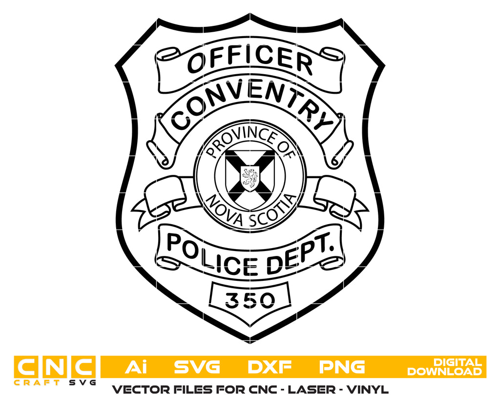 The Conventary Police Officer Badge SVG is a finely detailed Nova Scotia law enforcement emblem recreated in professional vector format. Perfect for CNC cutting, laser engraving, vinyl decals, uniform decoration, commemorative plaques, and official signage, this badge ensures clean, scalable results. With sharp vector lines, it works seamlessly on wood, metal, fabric, and acrylic. Ideal for police memorabilia, department recognition, and custom woodworking projects, this design delivers both authenticity and precision for engravers and collectors.