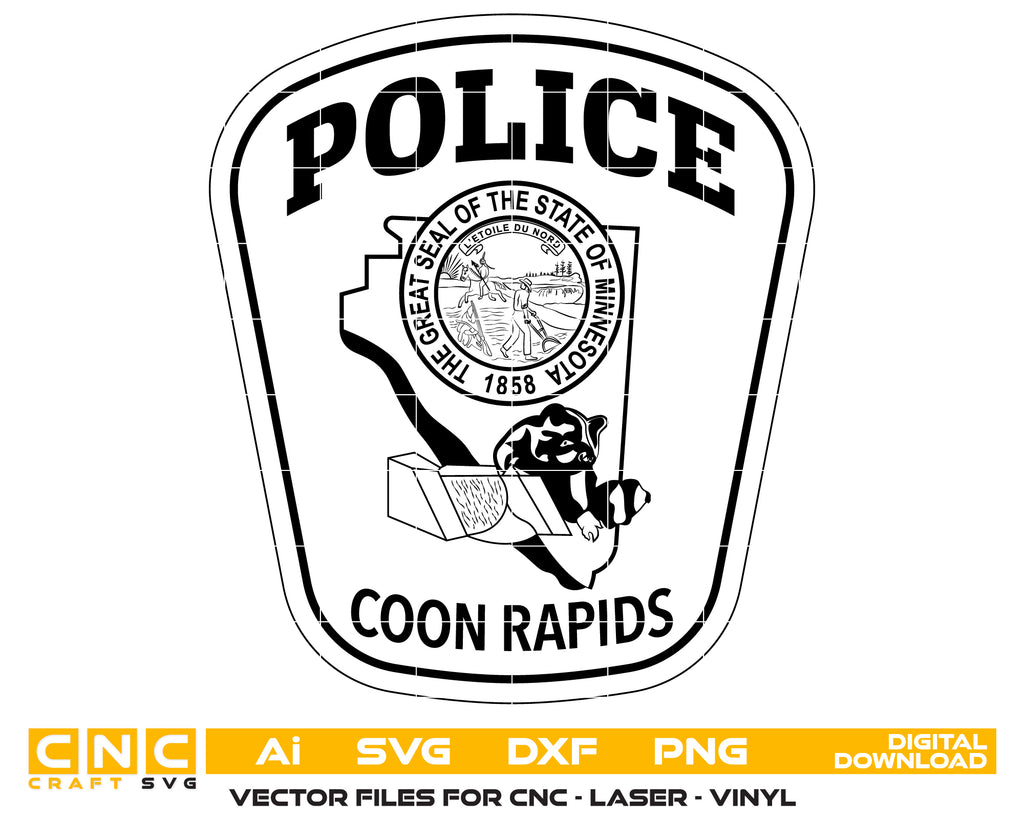 The Coon Rapids Police Patch SVG is a detailed Minnesota law enforcement emblem representing authority, service, and community protection. Designed in scalable vector format, it’s ideal for CNC cutting, laser engraving, vinyl decals, uniform patches, department signage, and commemorative plaques. Perfect for collectors, engravers, and custom police memorabilia, this patch delivers crisp detailing across metal, wood, fabric, and acrylic surfaces while reflecting the professionalism of the Coon Rapids Police Department.