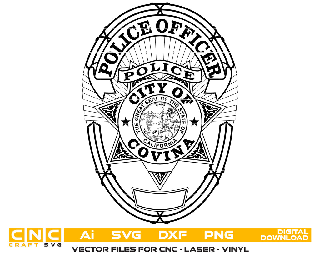 The Covina Police Officer Badge SVG is a finely detailed California law enforcement emblem representing authority, duty, and public safety. Designed in scalable vector format, it’s perfect for CNC cutting, laser engraving, vinyl decals, uniform badges, department signage, and commemorative plaques. Ideal for collectors, engravers, and custom police memorabilia, this badge ensures crisp detailing on metal, wood, fabric, and acrylic surfaces while showcasing the professionalism of the Covina Police Department.