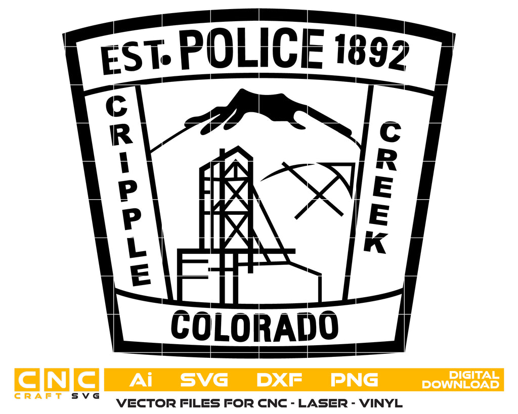 This professionally crafted Cripple Creek Colorado Police Logo vector file is designed for creators, crafters, and professionals working with digital fabrication tools. Delivered in multiple high-resolution formats, this logo is ideal for laser engraving, CNC routing, vinyl cutting, apparel printing, and other precision-based design projects.