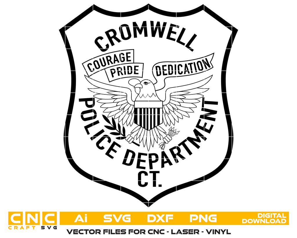 The Cromwell Police Department Patch SVG is a precise Connecticut law enforcement emblem recreated in professional vector format. Designed for versatility, it’s perfect for CNC cutting, laser engraving, vinyl decals, uniform patches, department plaques, and municipal signage. With sharp, scalable vector lines, it produces clean results on wood, metal, fabric, and acrylic. An excellent choice for police memorabilia, department recognition, and custom woodworking projects, this patch provides both authenticity and accuracy for engravers, makers, and collectors.