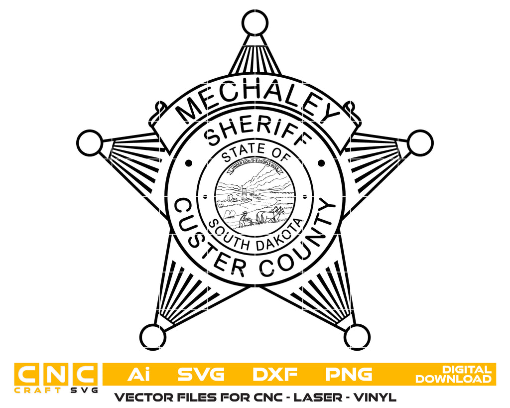Download the Custer County Sheriff's Office Badge SVG. This highly detailed South Dakota law enforcement vector features a classic 5-point ball-tipped star design with striking striated ray patterns on each point. The center proudly displays the official State of South Dakota seal, showcasing a historic scene of a farmer plowing, a river, and the state motto "Under God The People Rule." Complete with a top banner currently formatted for a name (Mechaley), this clean vector file is perfectly optimized for CNC routers, laser engraving, and vinyl cutting. It is ideal for creating custom sheriff or deputy retirement plaques, shadow boxes, and personalized department tribute gifts.