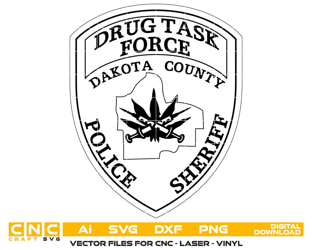 The Dakota County Drug Task Force Logo SVG is a professional Minnesota law enforcement emblem representing dedication, service, and public safety in drug enforcement operations. Designed in scalable vector format, it’s perfect for CNC cutting, laser engraving, vinyl decals, department signage, uniform applications, and commemorative plaques. Ideal for collectors, task force members, and custom engraving projects, this logo ensures crisp detailing across metal, wood, fabric, and acrylic surfaces.