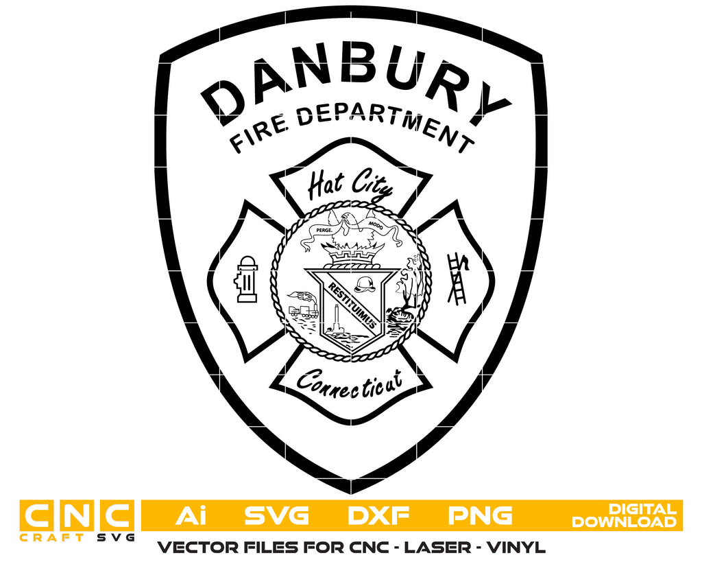 The Danbury Fire Department Badge SVG is a professional Connecticut firefighter emblem recreated in detailed vector format. Perfect for CNC cutting, laser engraving, vinyl decals, uniform decoration, commemorative plaques, and department signage, this badge produces crisp, scalable results. With sharp vector lines, it works seamlessly on wood, metal, fabric, and acrylic. An excellent choice for firefighter recognition, municipal memorabilia, and custom woodworking projects, it combines authenticity and precision for engravers, crafters, and collectors.