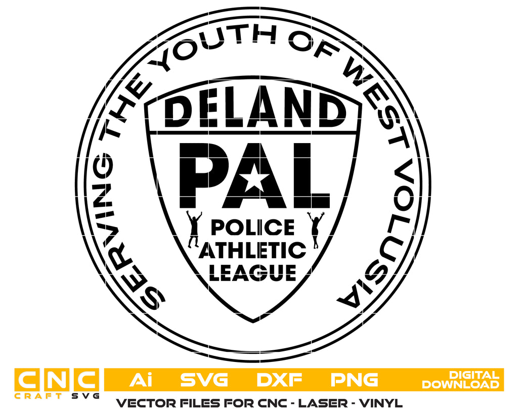 Download a clean and detailed vector version of the DeLand Police Athletic League Seal — perfect for engraving, printing, and cutting. This digital design is ideal for use with Cricut, Silhouette, Glowforge, and other machines. Use it on plaques, signs, t-shirts, tumblers, or any custom project that supports youth programs or honors law enforcement.