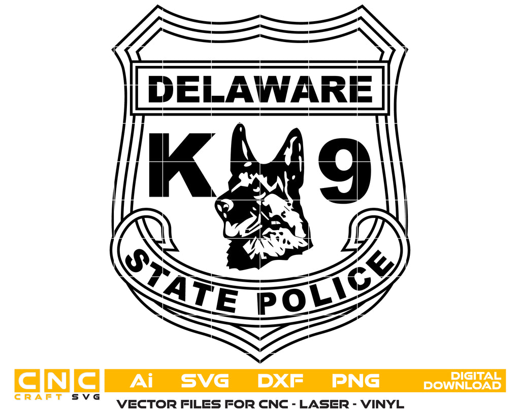 The Delaware State Police K-9 Unit Badge SVG is a high-quality law enforcement dog emblem representing the bravery, loyalty, and service of police K-9 teams. Designed in scalable vector format, it’s perfect for CNC cutting, laser engraving, vinyl decals, uniform badges, department signage, and commemorative plaques. Ideal for K-9 handlers, collectors, and custom police memorabilia, this badge delivers crisp detailing on metal, wood, fabric, and acrylic surfaces while honoring the Delaware State Police K-9 Unit.