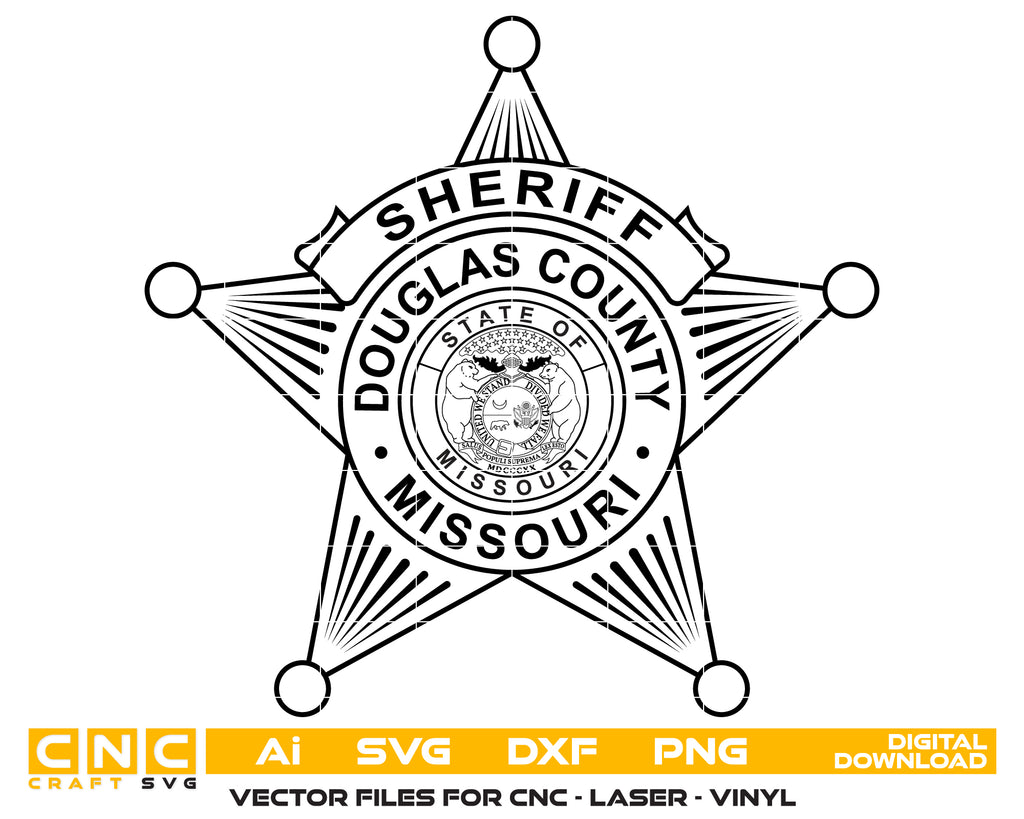 This Douglas County Missouri Sheriff Star Badge SVG is a high-precision vector design, perfect for professional fabrication. Featuring the classic six-pointed star with ball-tipped ends, the official State of Missouri seal (with the iconic two bears), and the "Sheriff" rank banner, this file is fully optimized with clean, closed paths to ensure flawless results on CNC routers, fiber lasers, and CO2 laser machines without any pixelation.