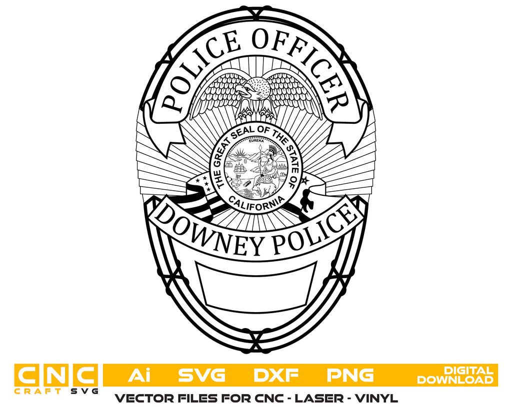 The Downey Police Officer Badge SVG is a detailed California law enforcement emblem representing authority, service, and community protection. Created in scalable vector format, it’s perfect for CNC cutting, laser engraving, vinyl decals, uniform badges, signage, and commemorative plaques. Ideal for collectors, engravers, and custom police memorabilia, this badge ensures crisp detailing on metal, wood, fabric, and acrylic surfaces while honoring the Downey Police Department.